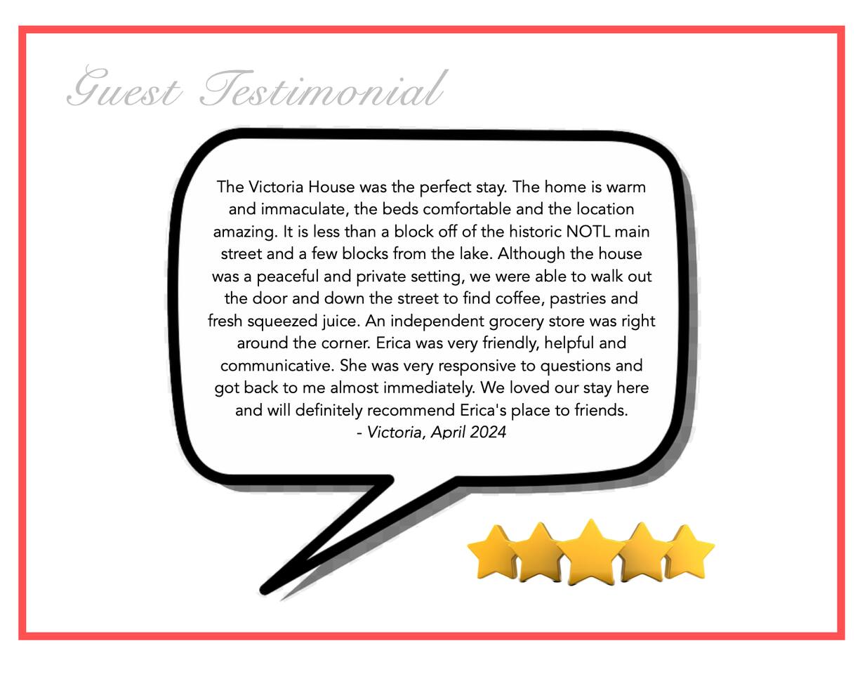 Welcome to Victoria House - a beautiful home for travellers to take in the finest that Niagara-on-the-Lake has to offer. With a location second to none, our home includes: - 3 bedrooms, 2 full bathrooms - complete kitchen with all appliances, dishware, glassware - fresh linens & towels included - large outdoor space with covered pergola & BBQ Literally steps to Queen Street, our home is minutes by foot to restaurants, shops, theatre, golf, Lake Ontario and all the best that NOTL has to offer!