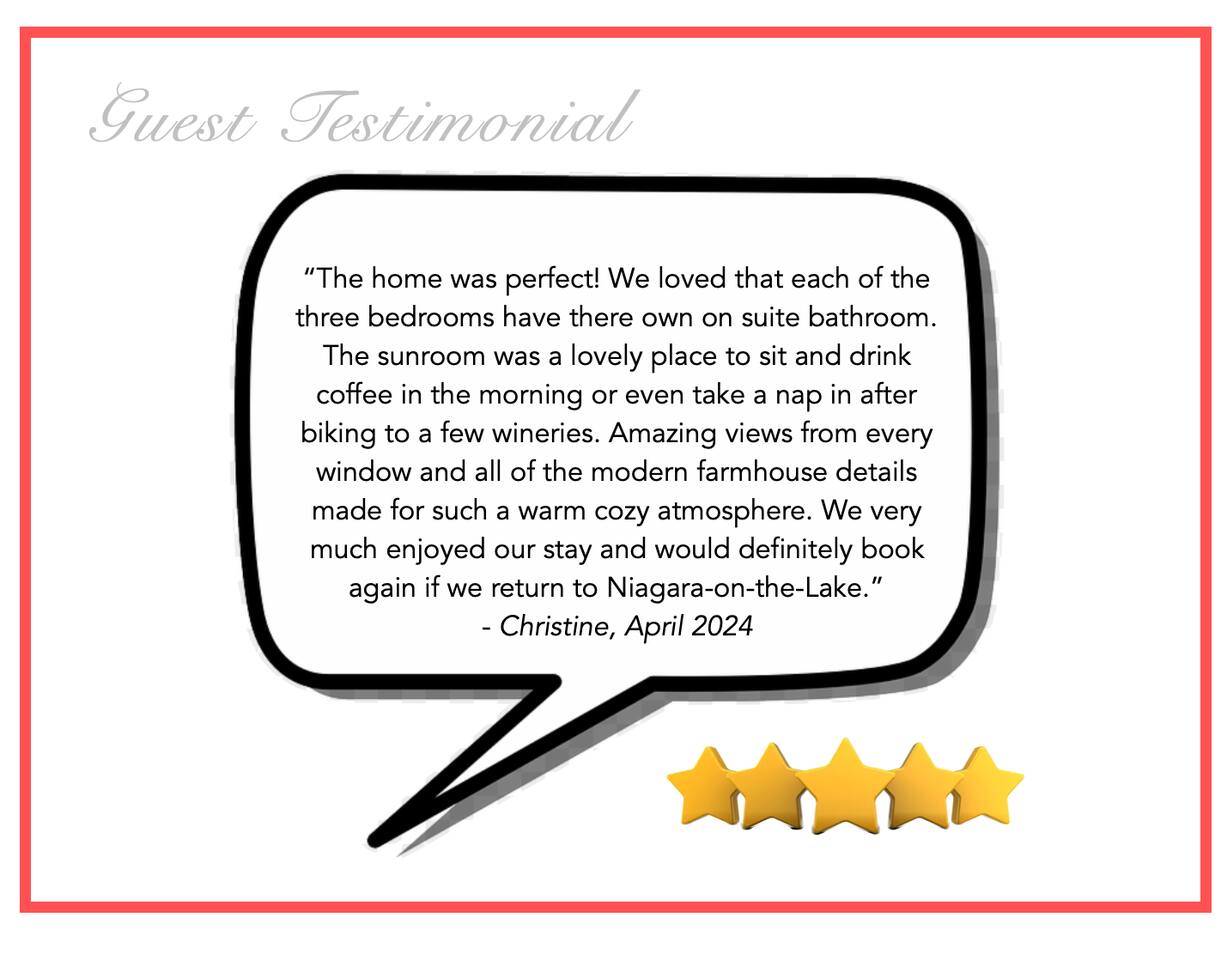 Located directly in the heart of Niagara-on-the-Lake's Wine Region, our 2500 square foot private farm home welcomes travelers with: - 3 queen bedrooms each with stunning en-suite - fully equipped luxury kitchen - hard flooring throughout - outdoor seating, dining & BBQ area Just minutes drive to the Old Town and all Shaw Festival Theatres, our home is complemented with WIFI, free parking, coffee & tea, and just 20 mins to famous Niagara Falls. We look forward to welcoming you to our home!