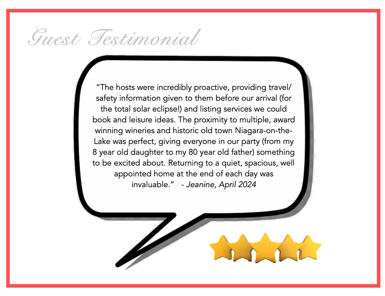 Our home was completely renovated in 2019 and transformed into a comfortable space for travellers to take in the finest that Niagara-on-the-Lake has to offer. Quality finishes, high end furnishings and thoughtful design make this home a one-of-a-kind Wine Country escape. Distance to: - Queen Street Old Town Tourist Area: 3 km - Shaw Festival Theatre: 7 km - Historic Fort George: 7 km - Niagara on the Lake Golf Club: 4 km - Niagara Outlet Collection: 13 km - Niagara Falls Tourist Area: 23 km The home is private to guests, disinfected between bookings, and with self check in no interaction is required, for a safe, contactless experience. We are pet friendly (pet fee applies) With a breathtaking location and honest and caring hosts, we hope to become your home of choice when visiting Niagara-on-the-Lake! IG @rentalsniagara ** We DO NOT allow weddings, wedding events, wedding parties or bachelorette or bachelor parties on this property and have exterior cameras in place to ensure no events as per our town requirements ***