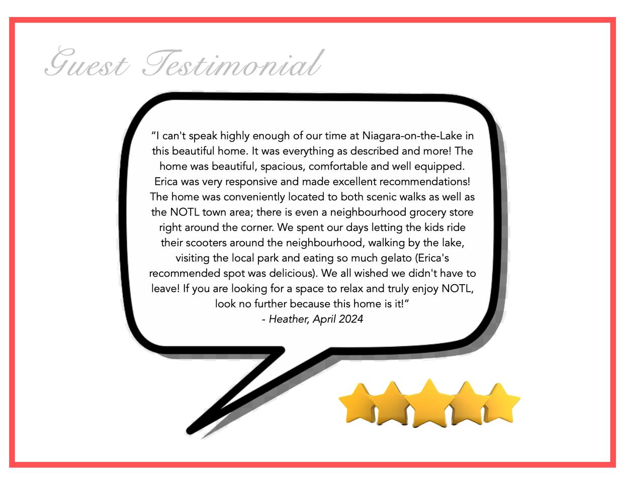 ** While we have a 2 night minimum on our home, on certain occasions we will accept one night bookings - please inquire with us ** Our home was completely renovated in 2019 and recreated into a modern, comfortable space for discerning travelers to take in the finest that Niagara-on-the-Lake has to offer. The home is private, disinfected between bookings, and no interaction with owners required. Quality finishes and thoughtful design make this home a one-of-a-kind Wine Country escape. - 2 spacious bedrooms each with en-suite full bathrooms, ROKU TV's - oversized luxury Chef's kitchen complete with gas stovetop, dual zone wine fridge and more - hard flooring throughout - hotel grade French linens and towels Our home is also complemented with WIFI, ROKU TV's (with ability to connect to guest streaming accounts - NO CABLE TV), free parking for 2 cars, coffee & tea and more! With a location second to none, we hope to become your home of choice when visiting Niagara-on-the-Lake! IG @rentalsniagara